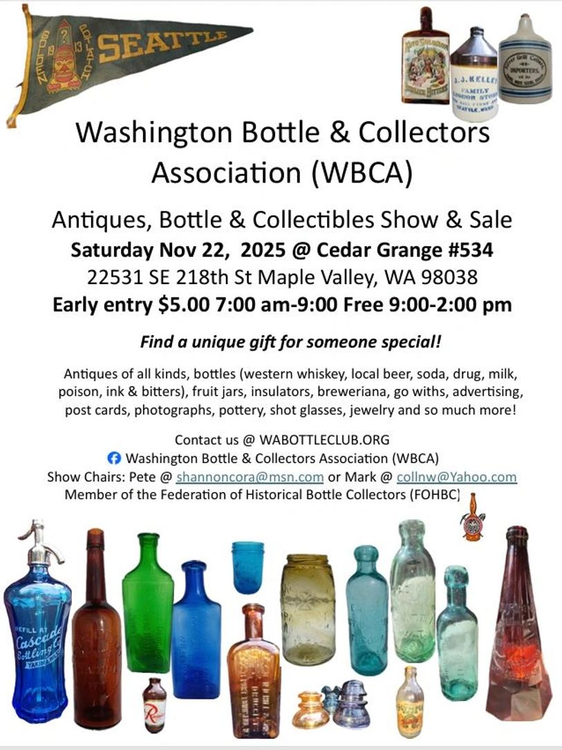 Info will also be posted on our Facebook site: Washington Bottle & Collectors Association (WBCA)