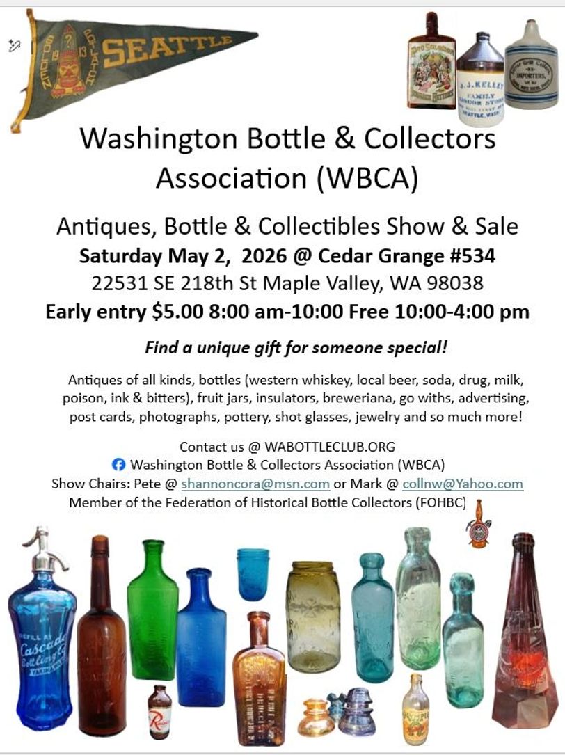 Info will also be posted on our Facebook site: Washington Bottle & Collectors Association (WBCA)